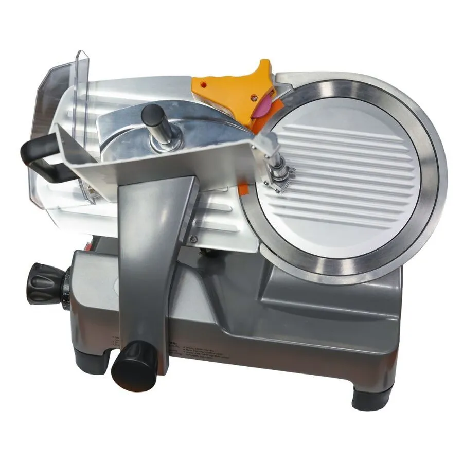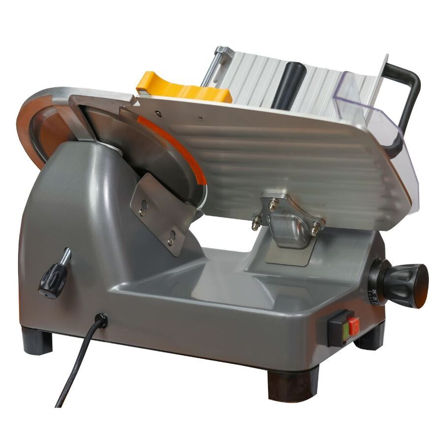 Equipped with a cooling fan motor, waterproof power switch, and stable, heavy base, this slicer ensures safe, reliable operation in any kitchen or butchering setup. It’s engineered for efficiency and long-term performance, allowing you to slice confidently without overheating.