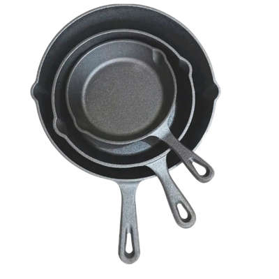 3pc Pre-Seasoned Cast Iron Skillet Set Includes 3 different sizes, heavy-duty cast iron for a non-stick finish and versatility.
