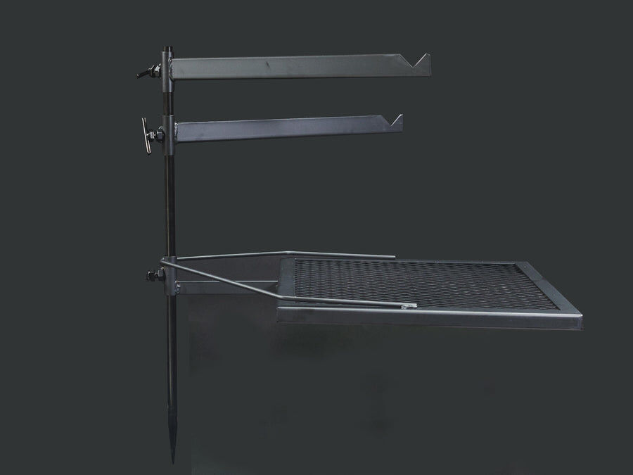 Heavy-gauge steel construction with flame-proof enamel finish, designed for grilling over an open fire, and adjustable height for versatility.