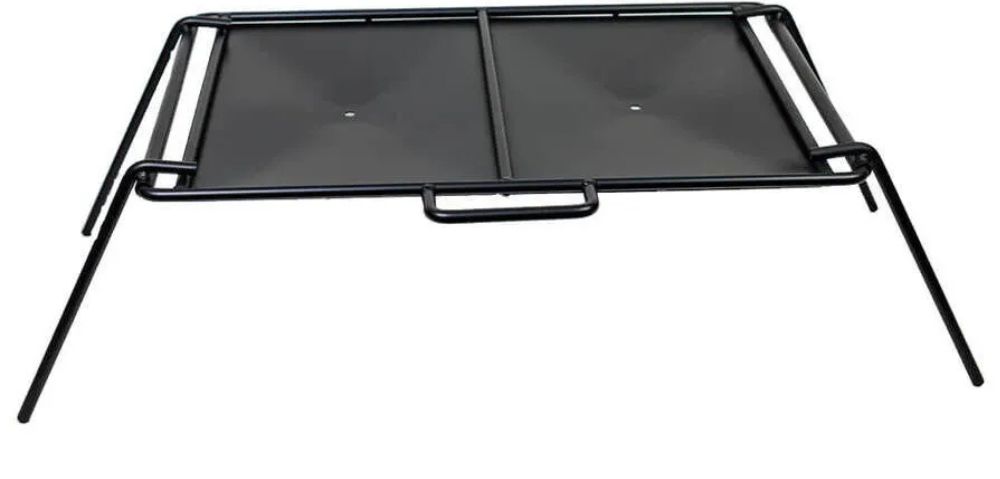 Flame-resistant painted surface with fold-down legs for easy storage and setup, and a cooking area perfect for outdoor meals.