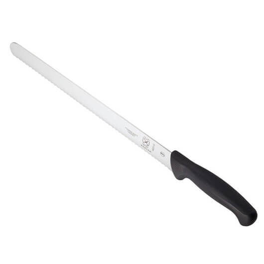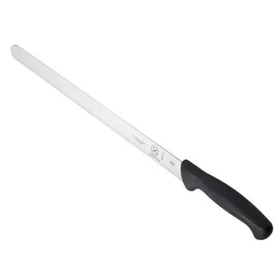 A trusted name when it comes to professional cutlery, Mercer Culinary produces high-quality professional knives. The Mercer 12" Wavy Edge Slicer-Millennia is no different. It features a high carbon stain-resistant steel wavy blade and black non-slip Santoprene / polypropylene handle with textured finger points and protective finger guard. This knife's scalloped edge allows it to slice through tomatoes, bread and sausages easily. Wavy edge especially useful for cutting soft products with hard crust or tough skin. NSF approved.