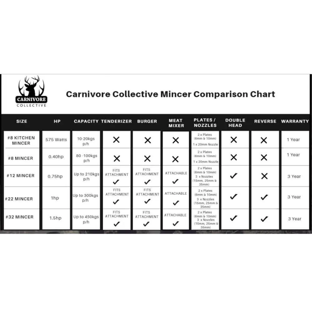 The Carnivore Collective #22 Meat Mincer is built for home butchers, hunters, farmers, and households who take food preparation seriously. Designed for those who want power, performance, and reliability in their sausage and meat processing, this mincer delivers professional-grade results from the comfort of home.