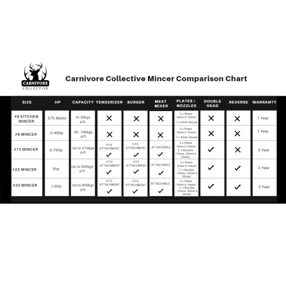 The Carnivore Collective #32 Meat Mincer is the perfect tool for home butchers, hunters, farmers, and households who want to create their own high-quality food products. Built for reliability and high performance, this mincer is ideal for crafting sausages, grinding meat, and handling tough cuts with ease.