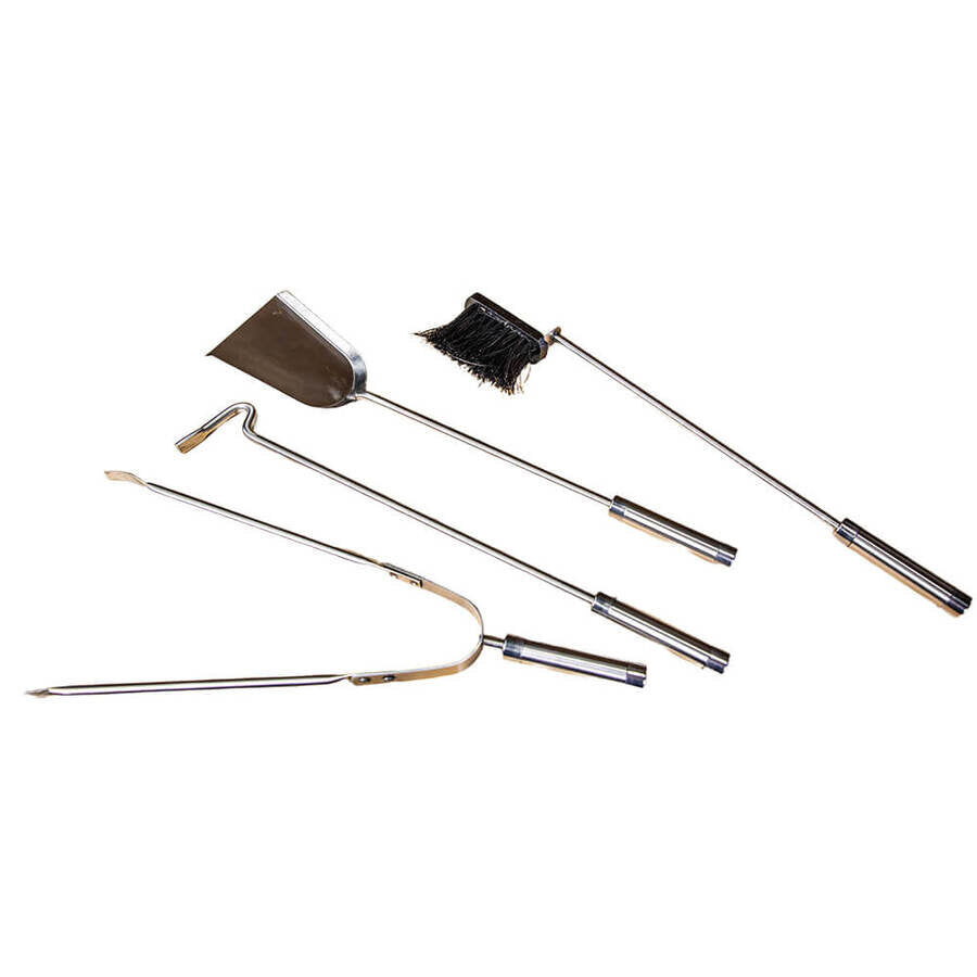 4 piece Fire Tools Set in Bucket Stand including a scrapper, shovel, broom, and log roller. Ideal for usage in front of fireplaces in the home.