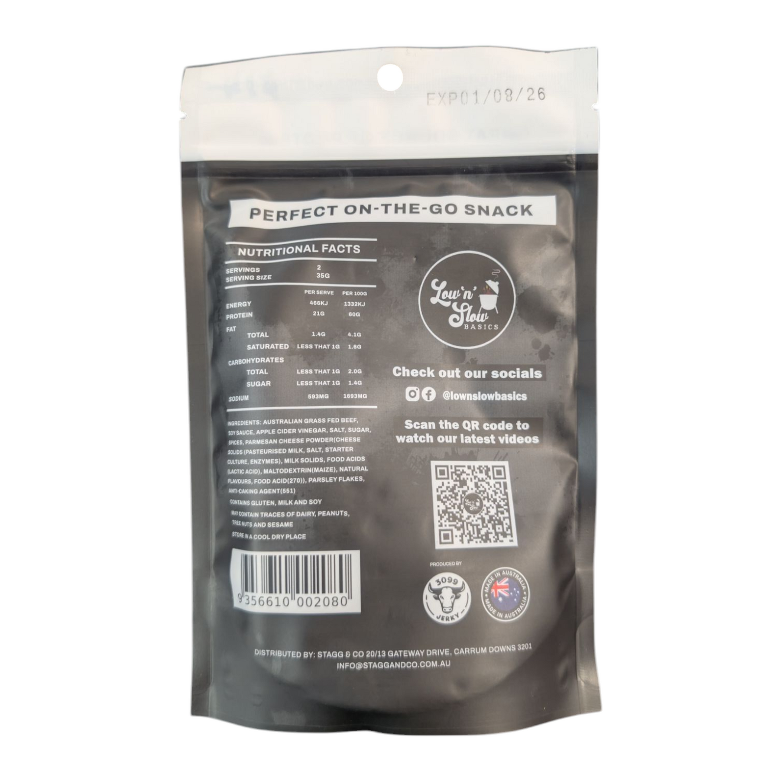 Garlic Goals Jerky is a standout addition to any shelf. Made with 100% Australian beef and seasoned with Low 'n Slow Basics' best-selling Garlic Goals rub, it delivers bold, familiar flavour your customers already know and love.