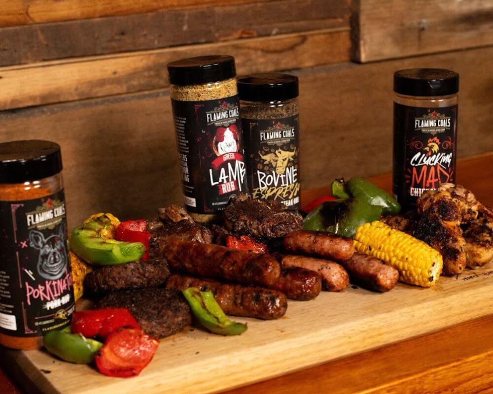 Applying Flaming Coals BBQ rubs to burger patties, chicken wings, lamb chops, and sausages on wooden boards, ready for grilling.