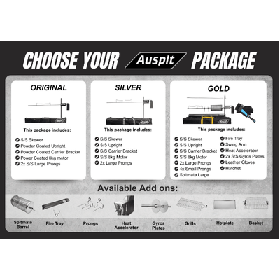Start simple, then build your Auspit setup over time. Add extra prongs for multiple cuts, a Spitmate basket for tumble cooking veggies, or a grill and hotplate for even more versatility. The modular design means you can transform your Auspit from a classic rotisserie into a full portable camp kitchen in minutes.
