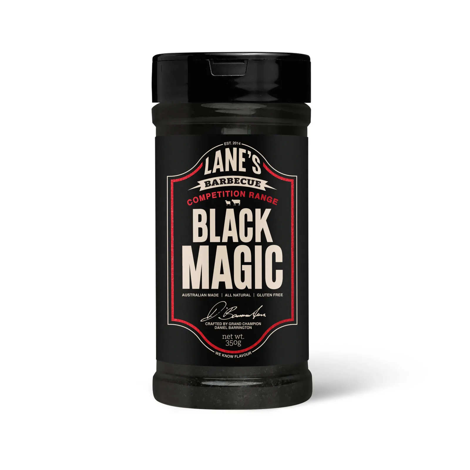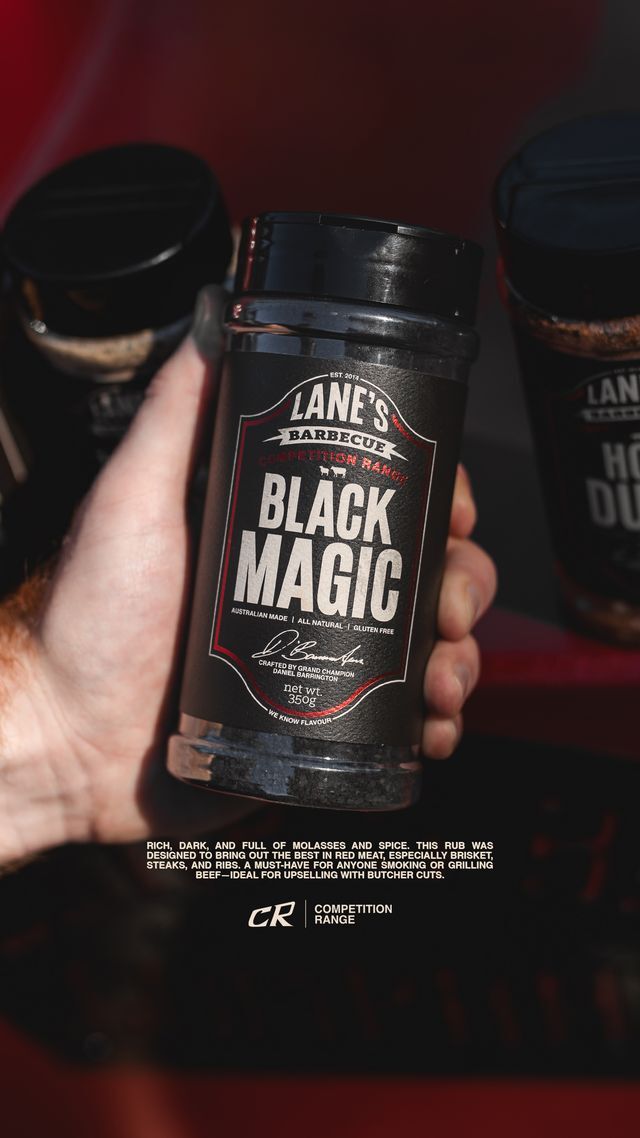Competition Range - Black Magic Pitmaster BBQ Rub | Lanes. Designed to deliver bold, beefy flavour straight from the bottle, this rub lives up to the hype. Packed with punchy notes of mushroom and sumac to intensify the rich beef profile, it's a game-changer-especially when paired with White Magic for that winning competition brisket.