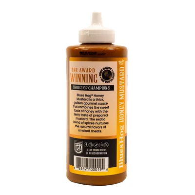 Blues Hog Honey Mustard Sauce comes in an easy-to-use 595g squeeze bottle. Honey Mustard is a thick, golden gourmet sauce that combines the sweet taste of honey with the zesty taste of mustard. An exotic blend of spices nurtures the natural flavours of smoked meats.
