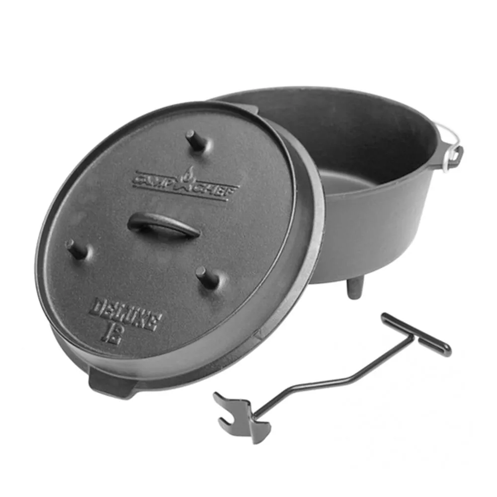 Camp Chef 12 inch Cast Iron Deluxe Dutch Oven. The lid doubles as a full-size skillet - expanding your cooking options. Just turn it over to fry your eggs, burgers and pancakes.