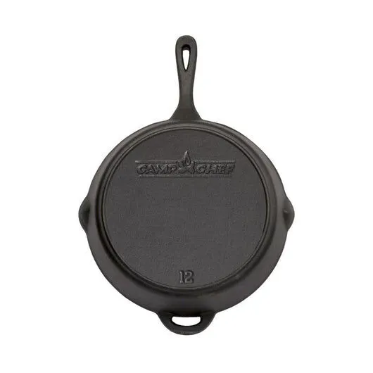 Quality, pre-seasoned Camp Chef 12 inch Cast Iron Skillet with dual pouring spouts.