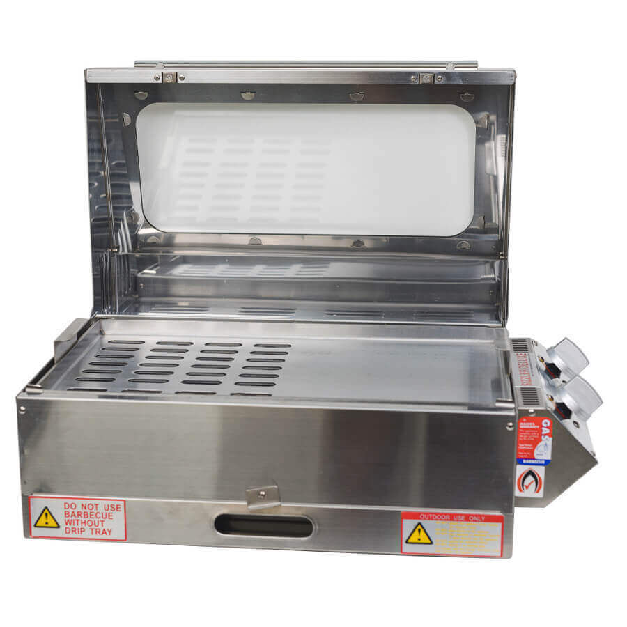 Introducing the Caravan BBQ - Sizzler Deluxe High Lid - 1/2 Grill & 1/2 Hotplate. A compact, sturdy, and versatile BBQ perfect for caravanning and portability. Ideal for cooking up a feast with its 1/2 grill and 1/2 solid plate griddle, the Sizzler Deluxe is built to handle your next outdoor adventure with ease.