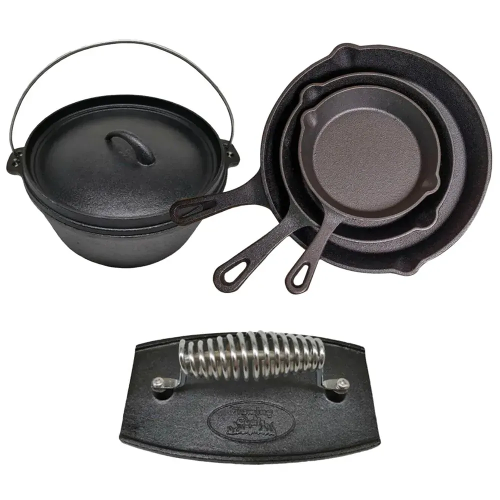 The Complete Cast Iron Cooking Arsenal The Cast Iron Cookware Combo with 9QT Camp Oven by Flaming Coals (Model: CASTIRON-COMBO-12) is the ultimate kit for serious outdoor cooks. With a large 9QT Camp Oven, 3-Piece Cast Iron Pan Set, and Cast Iron Burger Grill Press, you’ve got everything you need to cook roasts, stews, pizzas, bread, and burgers all with the unbeatable flavour of cast iron cooking. Whether you’re camping, cooking over coals, or grilling in your backyard, this combo gives you the tools to master every meal. All-Round Heat for Perfect Cooking The Flaming Coals 9QT Camp Oven is designed for flawless heat control. Its deep lid with a raised lip allows coals to rest on top, creating an even, all-round cooking environment. Slow-cook stews, bake golden loaves, or roast meats to perfection the cast iron’s superior heat retention ensures consistent results every time, while keeping food moist and tender. Cast Iron Pans That Get Better With Time The 3-Piece Cast Iron Pan Set includes 16cm, 19.5cm, and 24.9cm pans, each pre-seasoned and ready to use. With pouring spouts and integrated handles, these pans handle everything from searing steaks to baking cakes. Over time, they develop a natural non-stick surface, giving you cookware that doesn’t just last a lifetime it improves with every use. Juicy Burgers Made Simple Get BBQ perfection with the Flaming Coals Cast Iron Burger Grill Press. Designed to cook faster while locking in moisture, it flattens burgers for even cooking and that perfect sear. Preheat it on your grill, place it on top of your patties, and enjoy burgers that are crisp on the outside and juicy on the inside every single time. Built for Fire, Designed for Flavour Each piece in this combo is made from heavy-duty pre-seasoned cast iron, ensuring long-lasting durability and incredible flavour infusion. Whether you’re cooking over charcoal, an open flame, or in your home oven, cast iron distributes heat evenly and adds that unmistakable smoky depth to every dish. This set isn’t just cookware it’s a gateway to creating unforgettable meals, anywhere the fire burns.