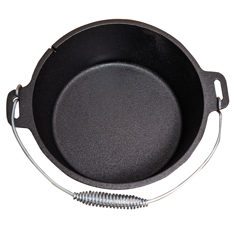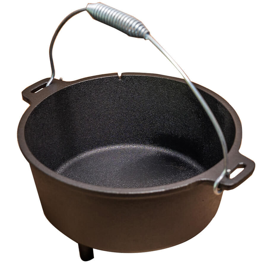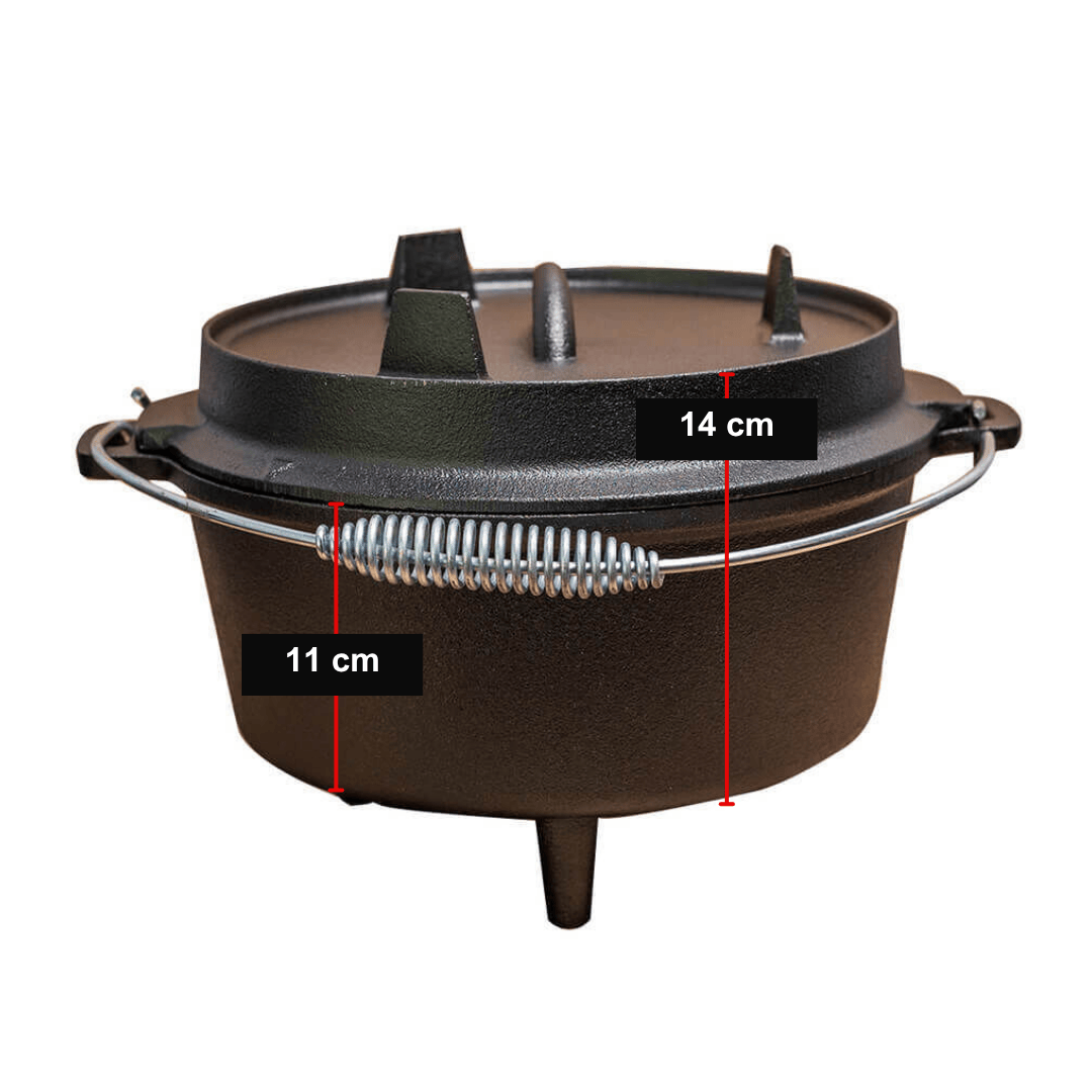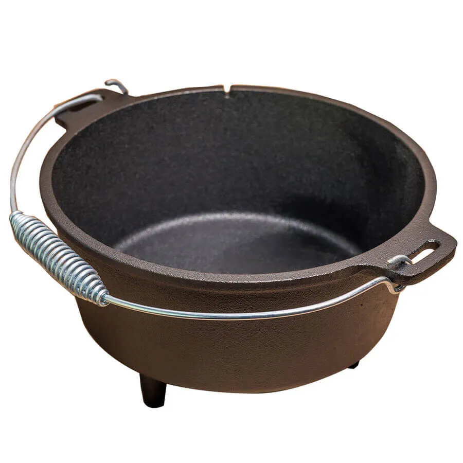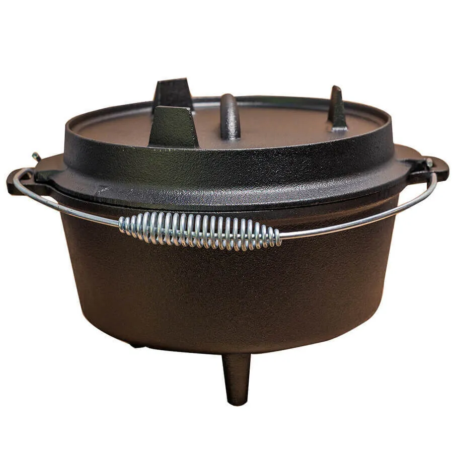 Made from heavy-duty cast iron, this Dutch oven is designed to last a lifetime of campfire cooking. Its thick-walled construction provides excellent heat retention and even cooking performance, ensuring that every meal is cooked to perfection whether over hot coals, a BBQ, or in your home oven. Perfect for campers who need reliability and strength in every cook.