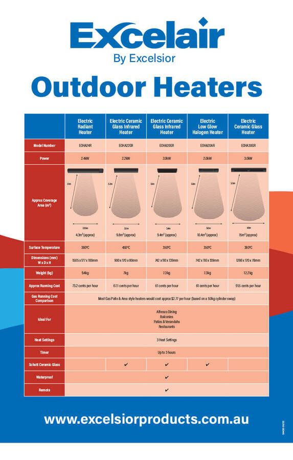 Experience luxury warmth with the Excelair Ceramic Glass Infrared Heater, the perfect blend of form and function for any modern outdoor setting.