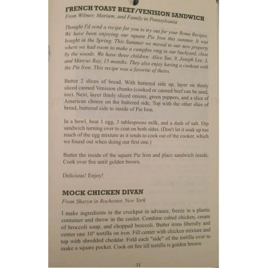 Creative Pie Iron Cooking Book - Cast Iron Toastie Recipes. For many years, Rome has supported a contest for pie iron recipes for fans of pudgy pies. This has led to the creation of an incredible variety of unique, homemade dishes. The best recipes were individually chosen and included in this cookbook by Richard O'Russa, the man who founded Rome.