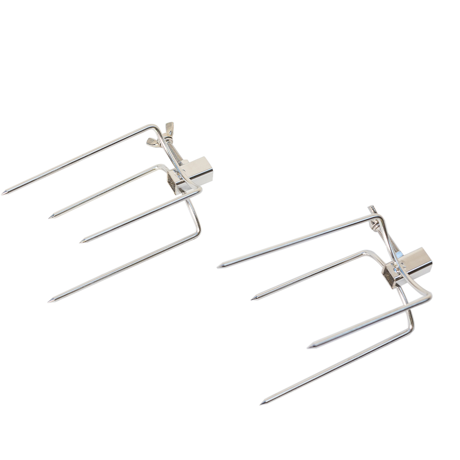 Suitable for affixing chickens, gyros, rolls of meat or pretty much any meat other than whole animals to a skewer. The long screw nut ensures you can fasten the prong tightly to the skewer to remove movement while cooking. Suitable for square spit roast skewers up to 10mm square in size. Will suit 6mm and 8mm square skewers also as the locking nut is long enough to penetrate through to the skewer.