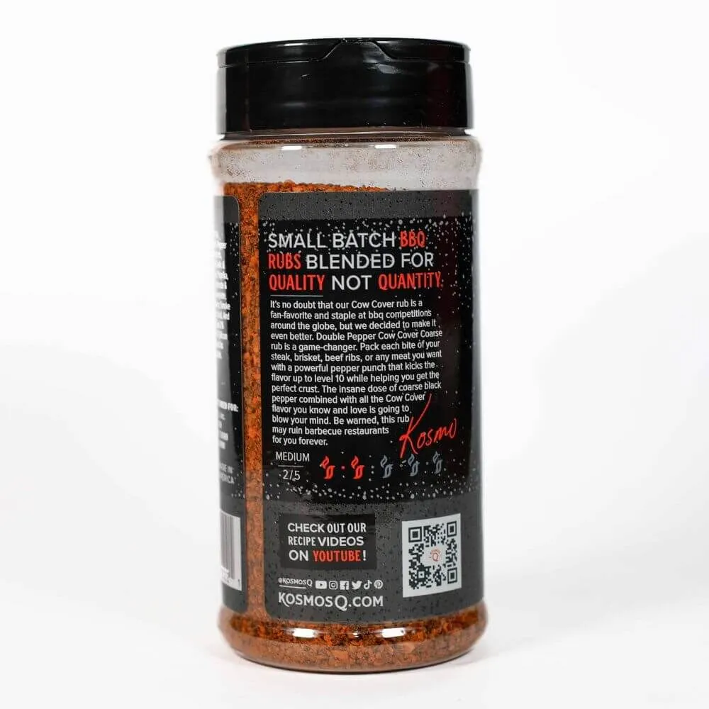 Double Pepper COARSE Cow Cover by Kosmos Q. Elevate your beef game with Kosmos Q's Double Pepper COARSE Cow Cover. Packed with bold flavour and a coarse texture, this seasoning is your secret to perfectly seasoned and crusted meats. Whether grilling, smoking, or roasting, it's your shortcut to championship-worthy BBQ every time.
