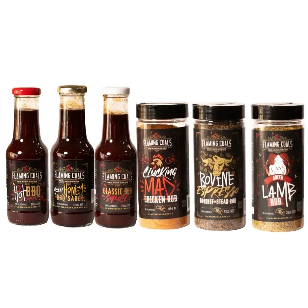 Flaming Coals Rubs and Sauces Combo Pack - Giftbox Set includes 3 of the new Flaming Coals Sauces and 3 of your favourite Rubs from Flaming Coals!