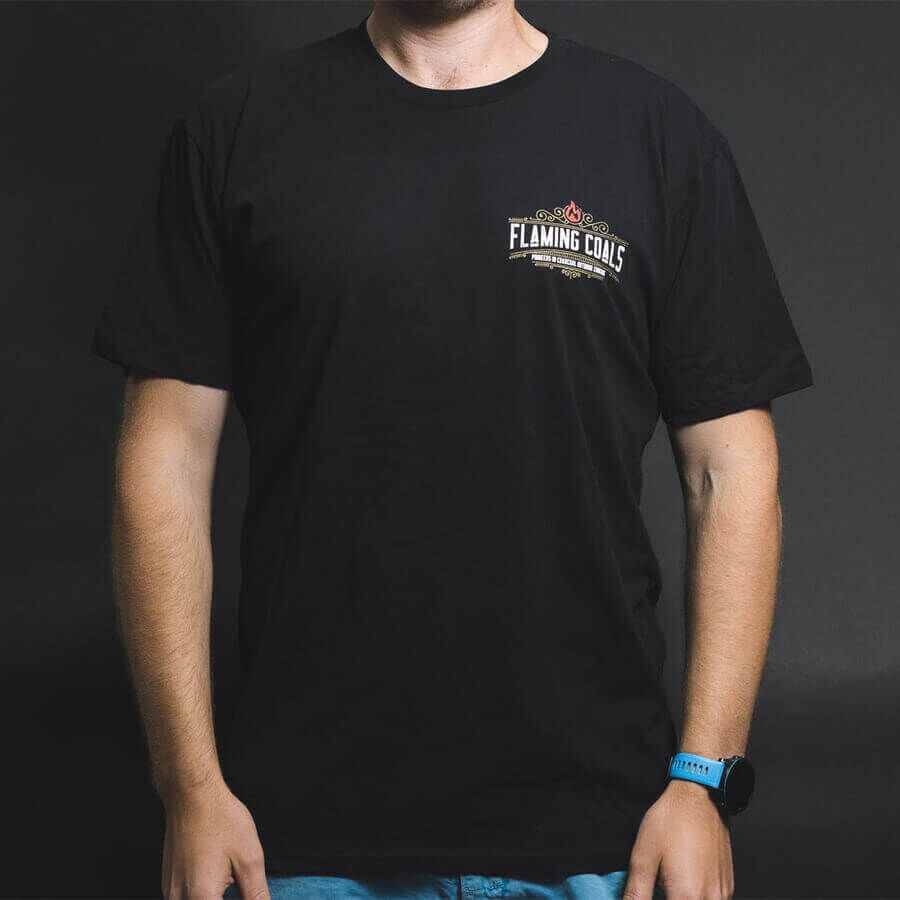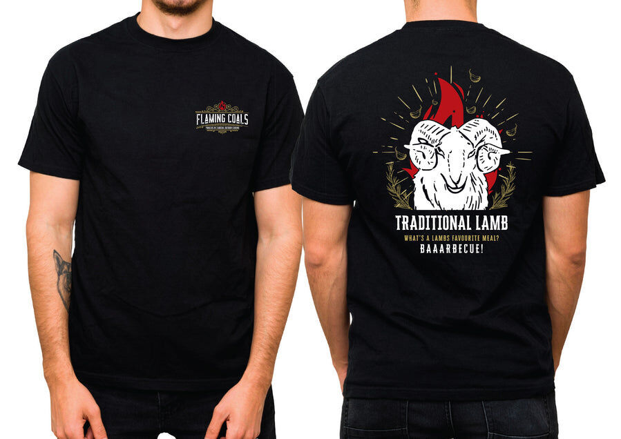 Flaming Coals T-Shirt- Lamb. Dad jokes go hand in hand with barbecuing so what better t-shirt to wear around the BBQ than one that combines the 2! Look and cook like a BBQ pro wearing the Flaming Coals Lamb-inspired tee