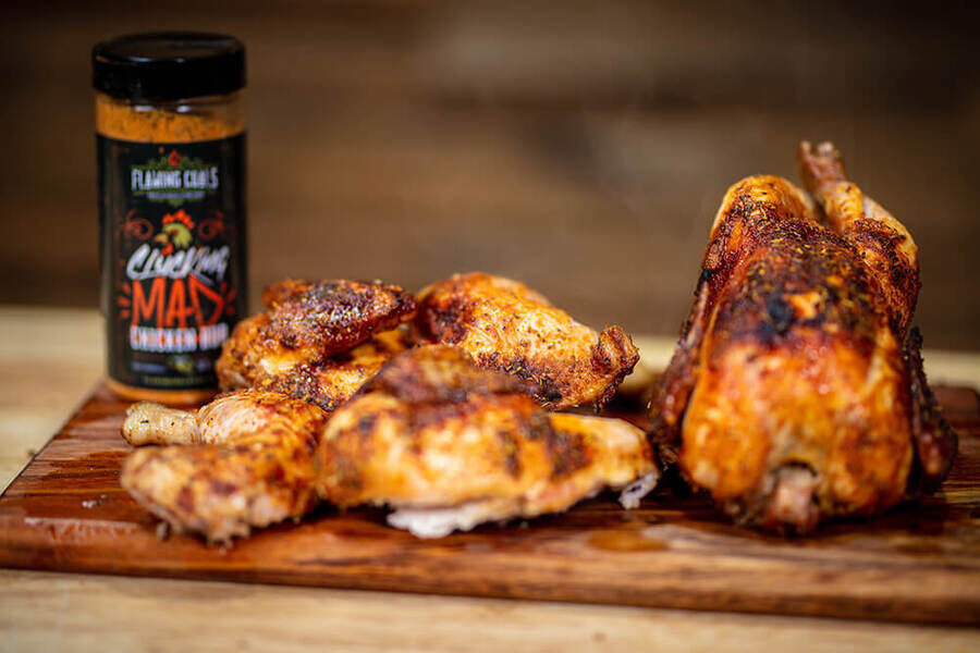 Flaming Coals Clucking Mad Chicken Rub - is an amazing combination of herbs and spices that will cause your taste buds to explode. Whether you're cooking whole chickens, breast or thigh, the Flaming Coals Clucking Mad chicken rub is to be a winner for the entire family