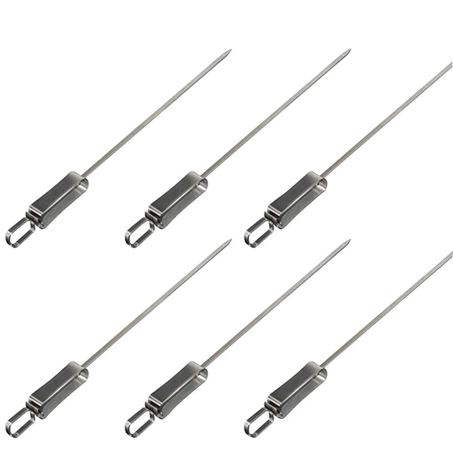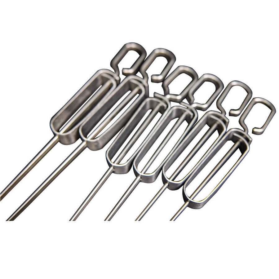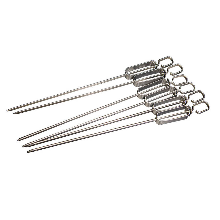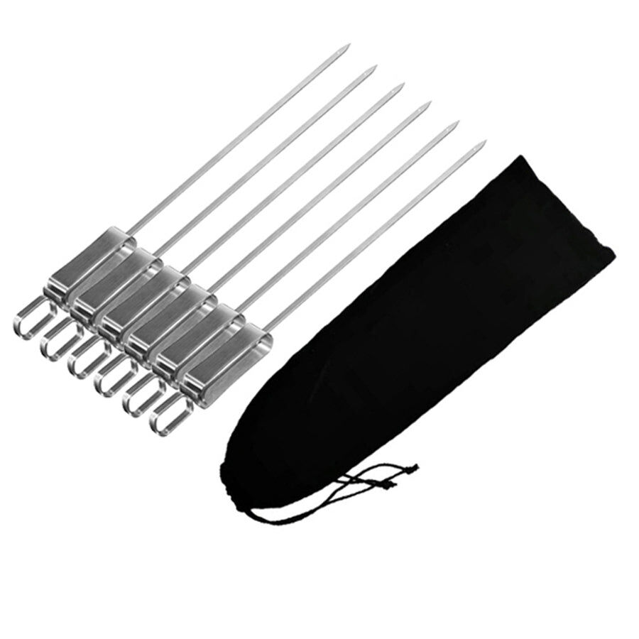The Flat BBQ Kebab Skewers with Easy Sliding Handle come in a 6-piece set with a storage bag and are made entirely of stainless steel. The handle slides along the shaft making the removal of your cooked food a simple task.