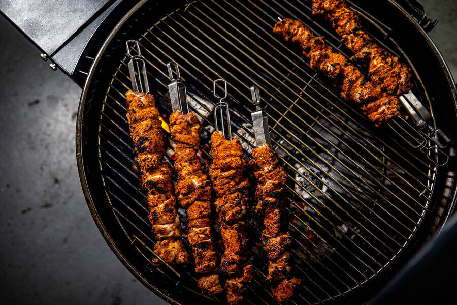 We all know the benefits of using flat metal kebab skewers over your timber skewers, however, these Kebab skewers have a nifty handle that slides along the shaft, helping you remove your cooked food without getting your hands dirty. The Flat BBQ Kebab Skewers with Easy Sliding Handle come in a 6-piece set with a storage bag and are made entirely of stainless steel for superior cooking results, making it ideal for use in the oven or on the grill. Each skewer comes with a slider for quick and simple removal of grilled food. The flat sections of the skewers also prevent the meat from rolling while cooking on your grill.