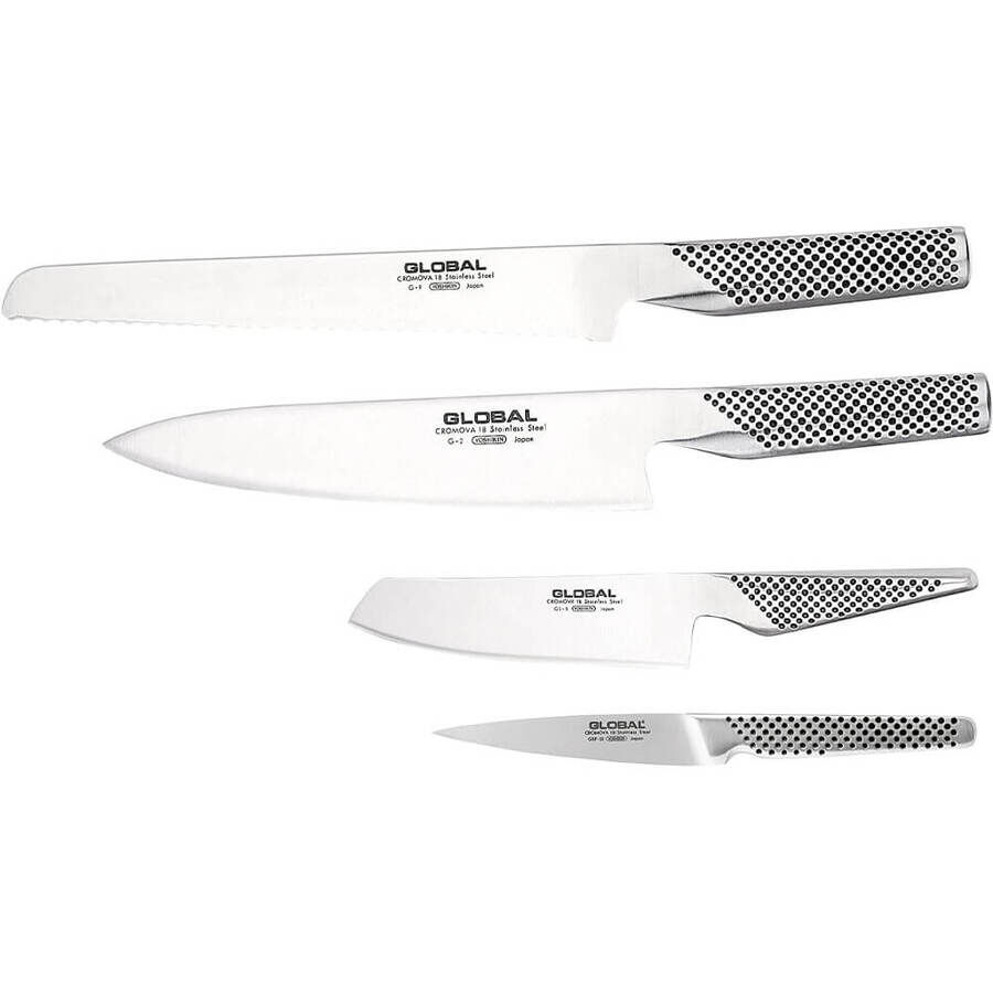 Global 5- Piece Ikasuv Knife Block Set. Made of hollow handles which are then filled with sand to achieve the correct weight and offer the perfect balance.