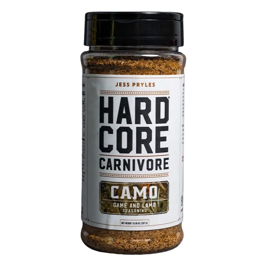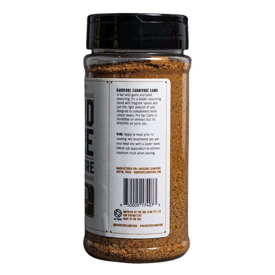 Hardcore Carnivore Camo Rub 297g will add incredible flavour to your lamb and game meats, with exotic notes of coriander fragrant spices and just the right amount of salt. Unlike other seasonings, CAMO is designed not to overpower the meat but to enhance it. Just apply it to meat before cooking. We recommend you pat your meat dry with a paper towel before rub application to encourage maximum crust when searing.