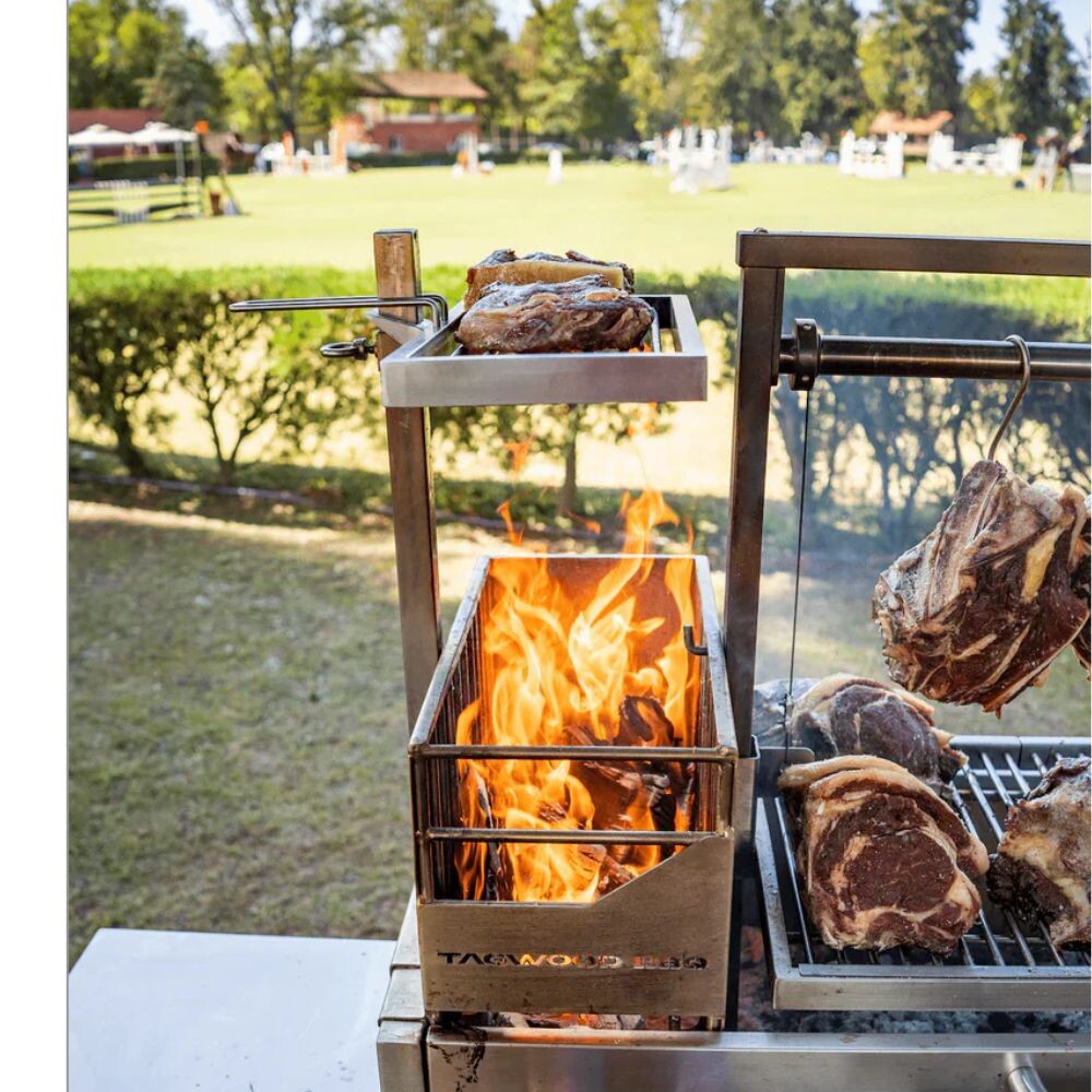Tagwood height adjustable secondary grate cooking steak above wood fire on parrilla grill