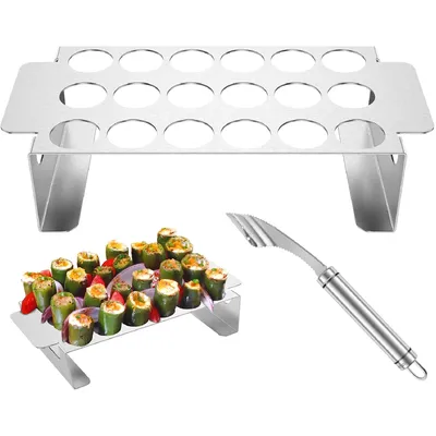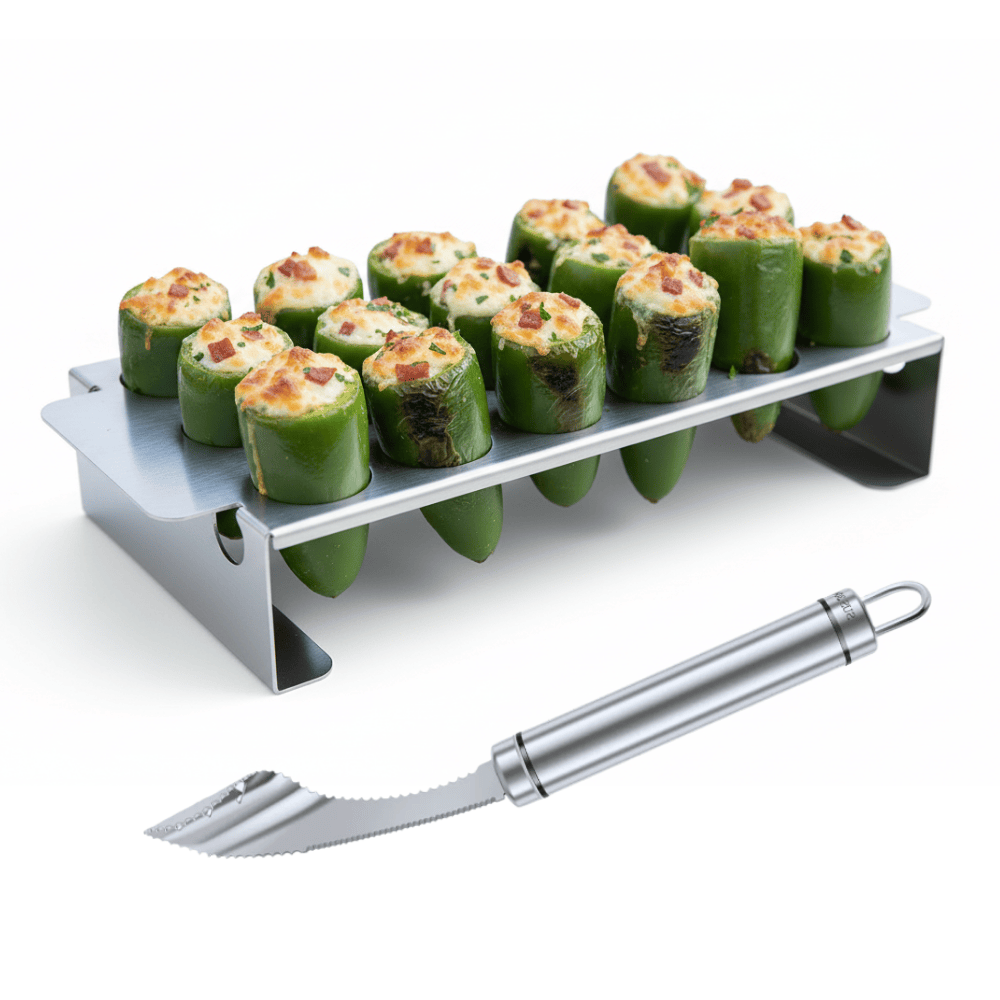 Take your appetisers to the next level with the Jalapeno Poppers Rack with Corer Tool. Load it up with stuffed jalapeños, mini peppers, or even chicken drumsticks and enjoy perfect results every time. This heavy-duty stainless steel rack keeps everything upright for even cooking without the mess.