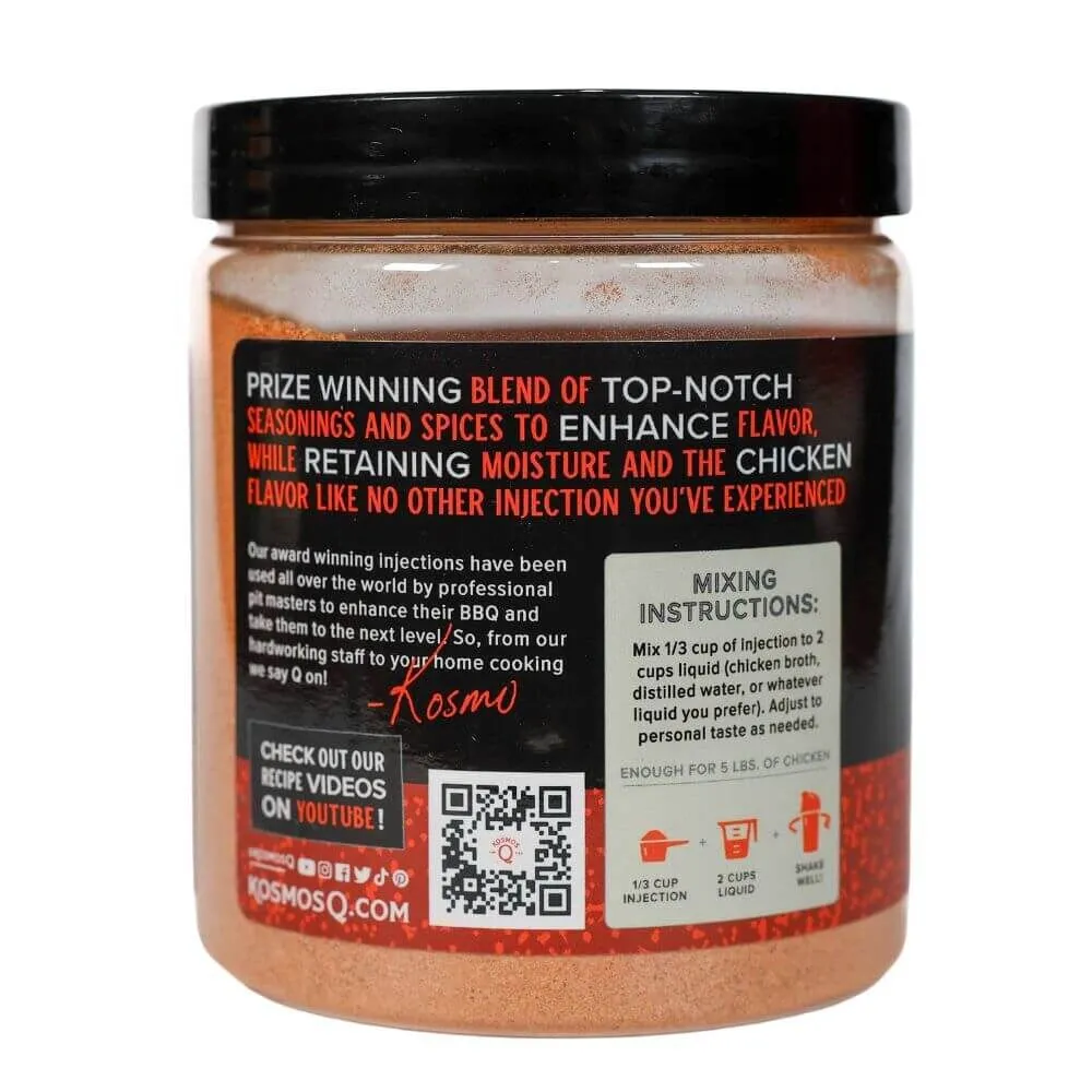 Kosmos Q Cajun Chicken Injection. Elevate your chicken dishes to bold new heights with Kosmos Q Cajun Chicken Injection. Crafted for flavour enthusiasts, this injection blend infuses your poultry with a tantalizing Cajun kick. Simply mix 1/3 cup of seasoning with 2 cups of liquid, whether it's chicken broth, distilled water, or your preferred choice, and let the magic unfold. Perfect for up to 5 lbs of chicken, this injection ensures every bite bursts with savoury Cajun goodness. Unleash the flavour and make every meal unforgettable with Kosmos Q Cajun Chicken Injection.