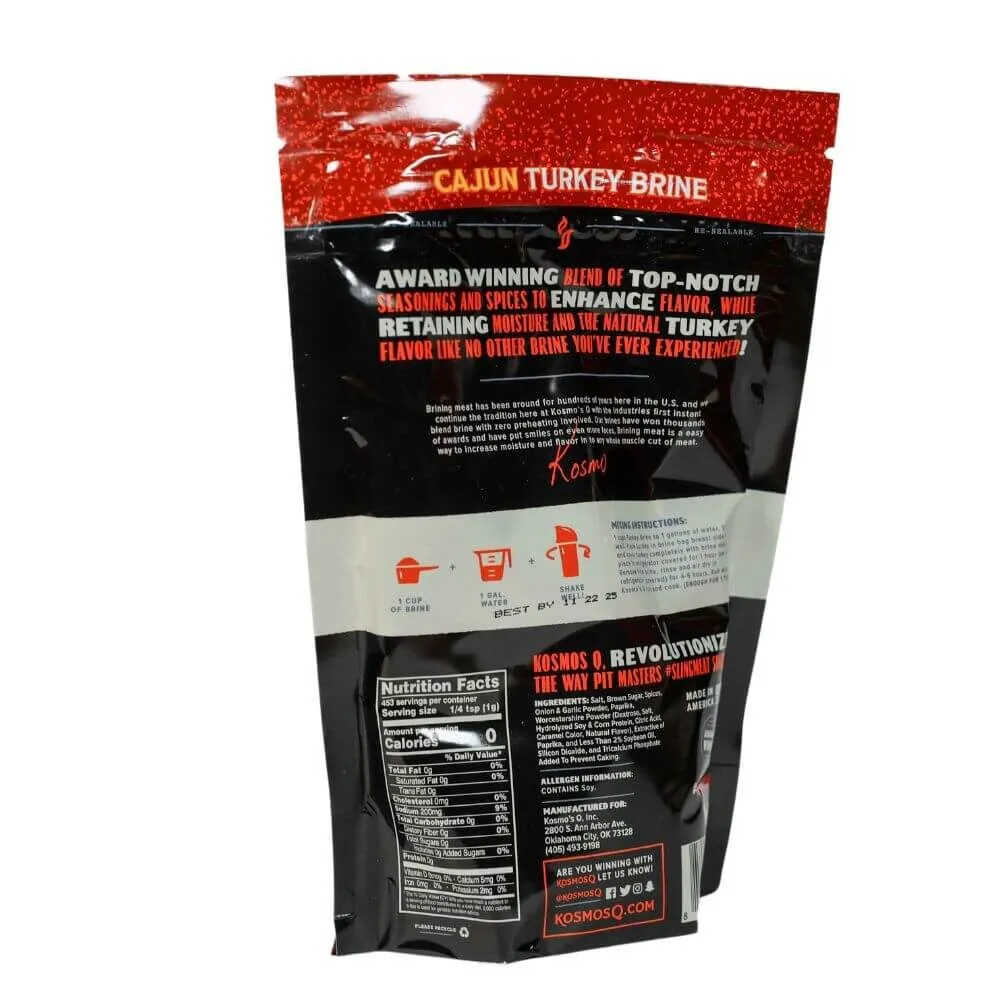 Kosmos Q Cajun Turkey Brine. Elevate your holiday feast with Kosmos Q Cajun Turkey Brine. This special blend guarantees a juicy, flavour-packed turkey with an unforgettable Cajun twist. Easy to use, just mix 1 cup of brine with 1 gallon of water, soak your turkey, and prepare for a culinary delight. Ideal for pairing with Kosmos Q rubs, this brine is your secret to a perfectly seasoned, succulent turkey that's bound to impress.