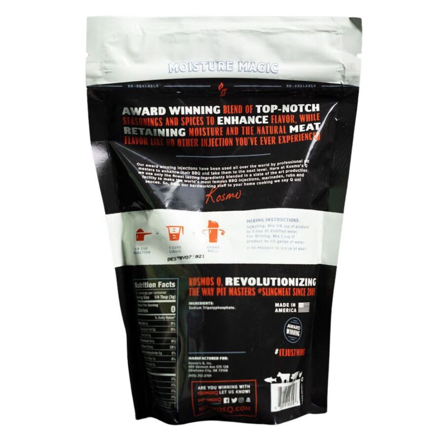 Kosmos Q Moisture Magic Injection is a top-quality competitive BBQ Phosphate, 100% made in the United States. You can add it to pork, brisket, chicken, ribs, and fish, giving them a fantastic flavor and consistency.