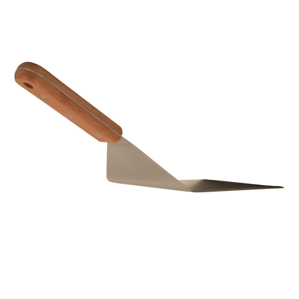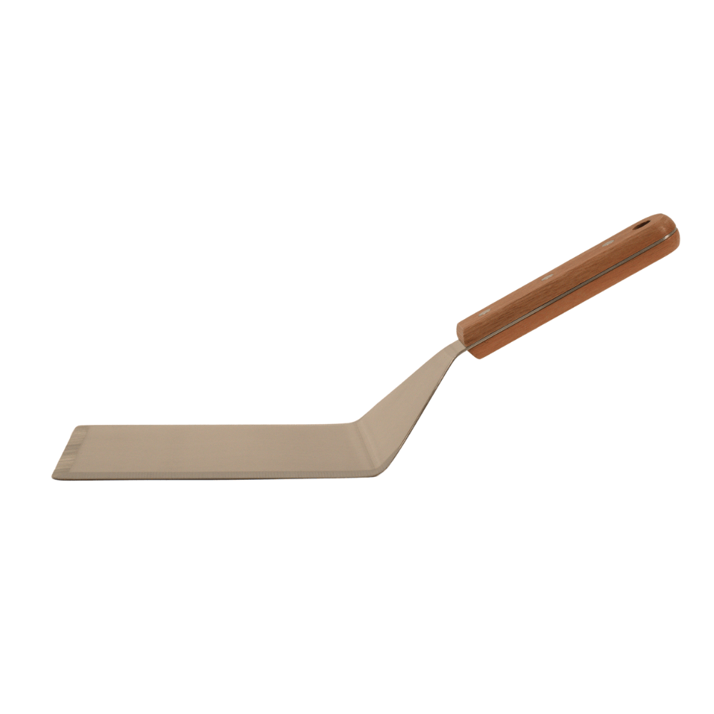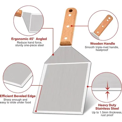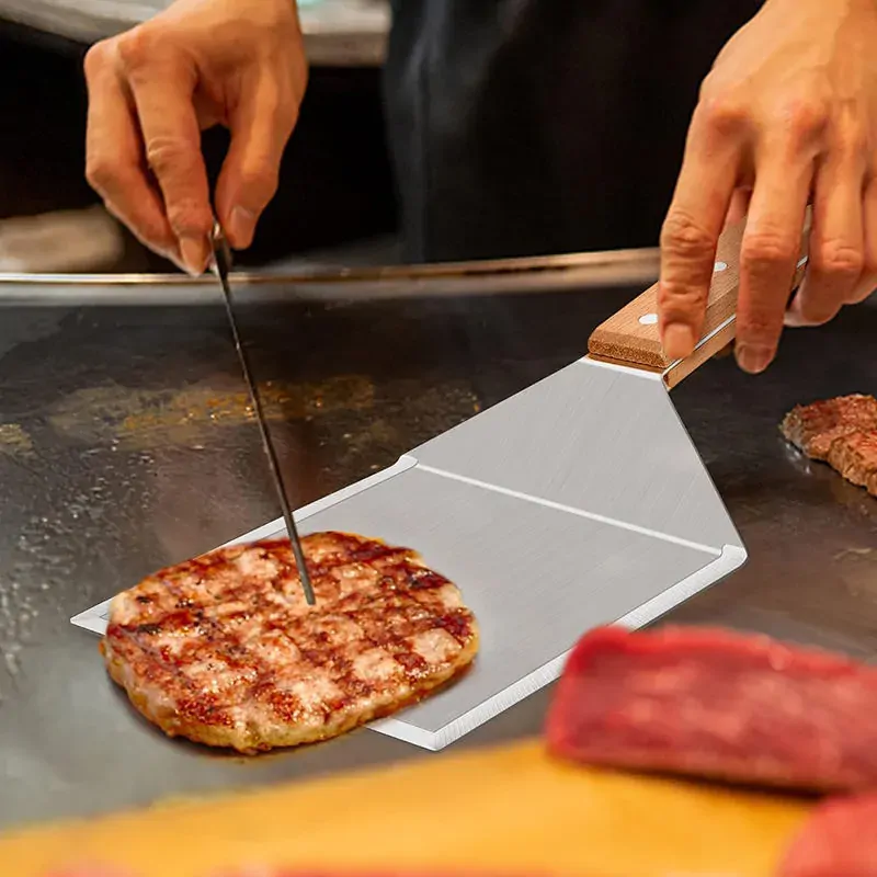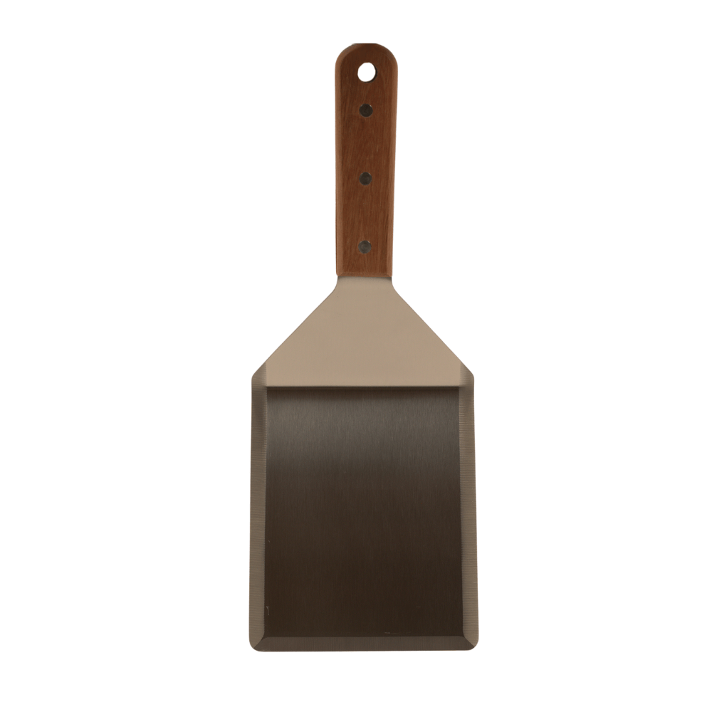 Made from food-grade stainless steel with a solid 1.5mm thickness, this durable spatula won’t bend under pressure. It’s strong enough to smash burger patties and support heavier foods with ease. The full tang design is complemented by a tight and comfortable wooden handle, secured with triple rivets for maximum strength and control.