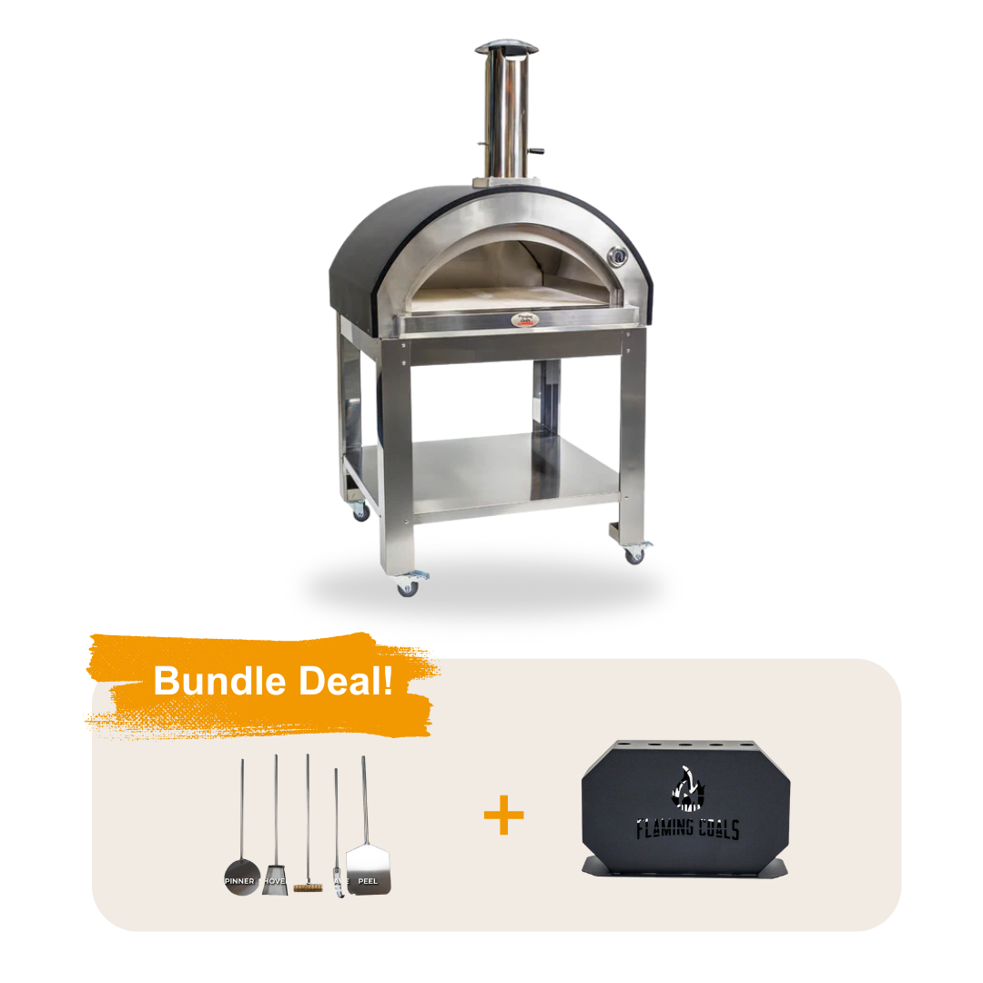 PACK INCLUDES: Marine Grade Wood Fired Pizza Oven | Flaming Coals, Flaming Coals Stainless Steel Pizza Oven Tool Kit , Flaming Coals Pizza Oven Tool Stand