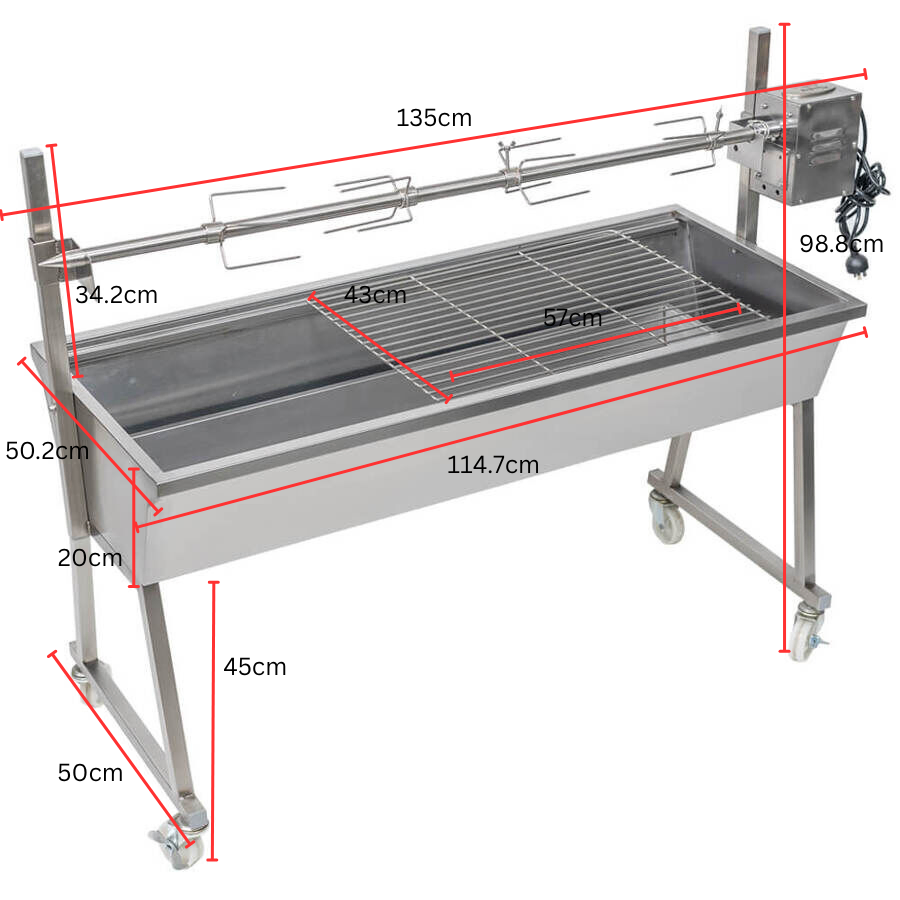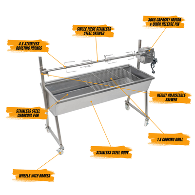 The Master 1200 Stainless Steel Spit Roaster is built to make spit roasting simple, fast, and reliable. Designed for backyard cooks who want long lasting stainless steel quality without complicated setup, this roaster assembles in under five minutes and delivers consistent results for gyros, chickens, and roasts.The Master 1200 Stainless Steel Spit Roaster with 30kg Motor