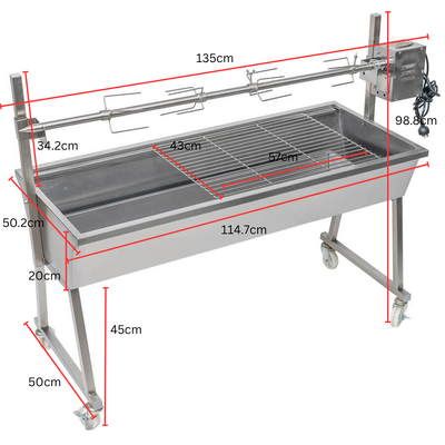Accessories Included 4x prongs, single-piece skewer, 30kg motor, grill, charcoal pan, wheels