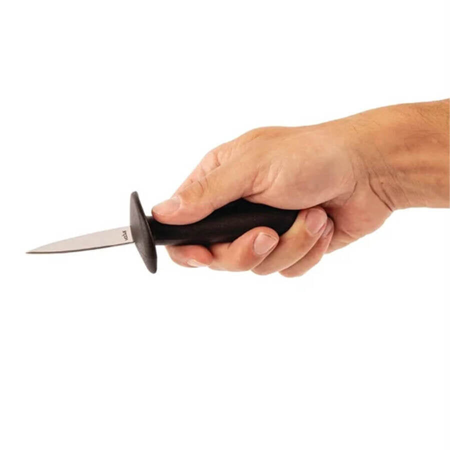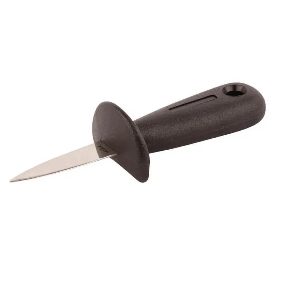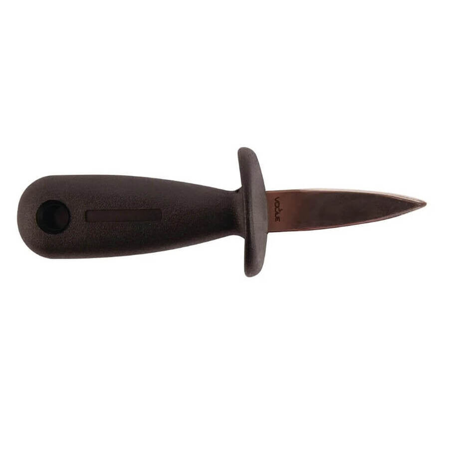 Vogue Oyster Knife. Looking for a simple way to shuck oysters? The Vogue Oyster knife will be perfect for you in that case. Since this knife is made of stainless steel, it is strong and sturdy and will last a long time in a busy kitchen. The bolster guard further lessens the chance of damage by preventing the hand from slipping onto the blade. A comfortable and secure grip is created by the plastic handle, making it ideal for constant use.