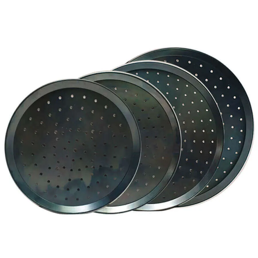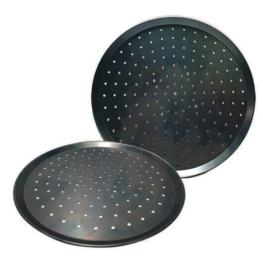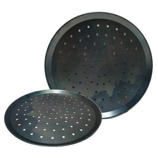 This commercial-quality, aluminium pizza pans come with an angled edge to avoid losing that delicious home-made pizza over the side. The holes promote airflow so that the dough can cook evenly and give you a perfectly cooked crust. It also enables moisture to escape preventing a soggy crust. Easy to slide under with a pizza peel, the Flaming Coals Perforated Black Pizza Tray is the perfect accessory for your pizza oven.