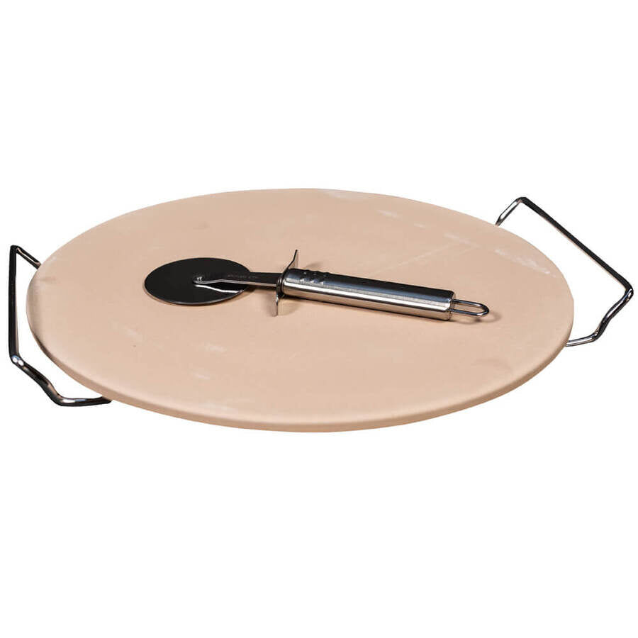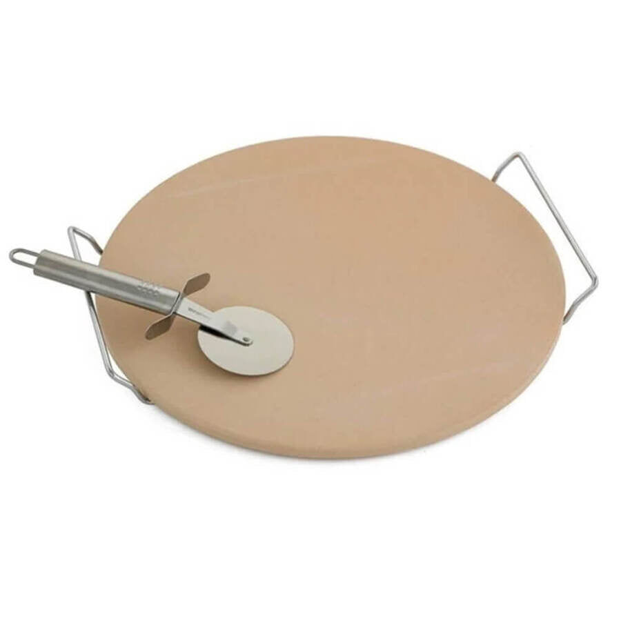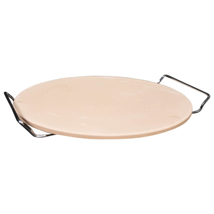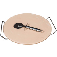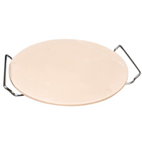 Bake a crispy pizzas, crusty bread, crunchy cookies and more with the Avanti Pizza Stone with Rack and Cutter. The natural kiln-fired clay disc absorbs excess moisture and distributes the heat evenly, producing light crispy crusts just like an authentic brick pizza oven. Safe for use in the microwave or oven, the 33cm stone features a chrome carrying rack.
