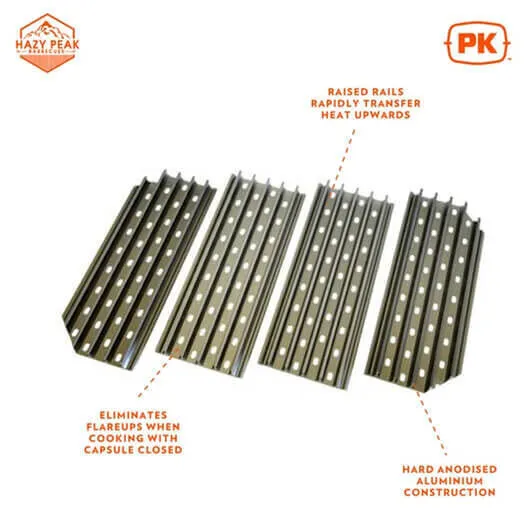 While your PK is designed to eliminate flare-ups when cooking with the capsule closed, GrillGrates will block flare-ups from burning your food while the lid is open. This is great for cooking steaks at very high temps and achieving a steak house quality sear. GrillGrates are made of hard-anodized aluminium, which conducts heat efficiently. The worlds best competition steak cooks cook on PK Grills using GrillGrates. If you love to cook steak, chops, chicken breast or any other "hot and fast" food, you need a set of these.