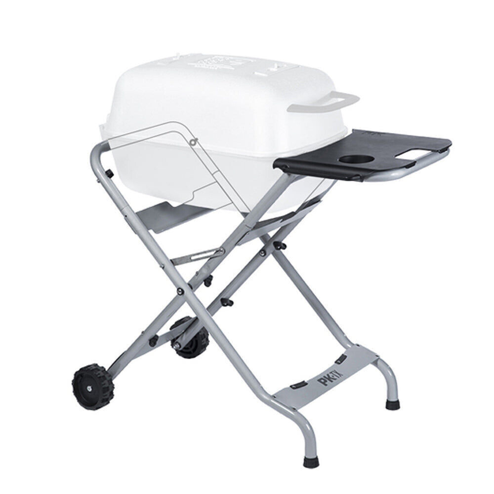 PK Grills PK TX Folding Stand folds down for easy transport. Throw your Original PK and a bag of charcoal on it and take it wherever you want to go. With 5 inch rubber wheel and all aluminium construction.