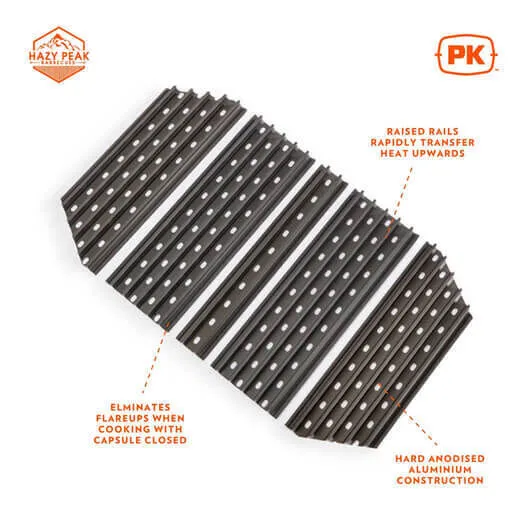 While your PK is designed to eliminate flare-ups when cooking with the capsule closed, GrillGrates will block flare-ups from burning your food while the lid is open. This is great for cooking steaks at very high temps and achieving a steak house quality sear. GrillGrates are made of hard-anodized aluminium, which conducts heat efficiently. The worlds best competition steak cooks cook on PK Grills using GrillGrates. If you love to cook steak, chops, chicken breast or any other "hot and fast" food, you need a set of these.