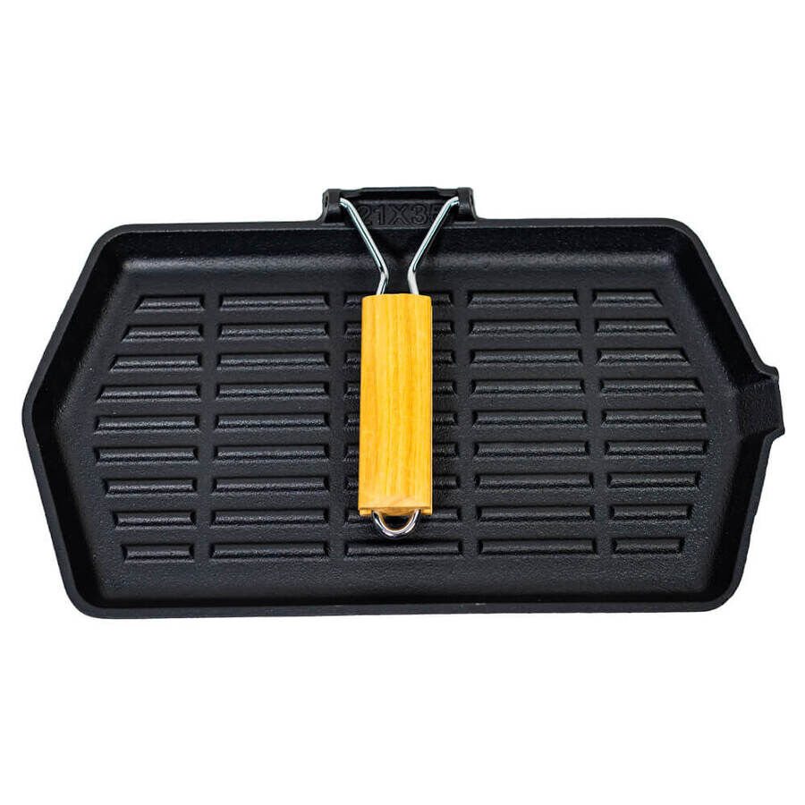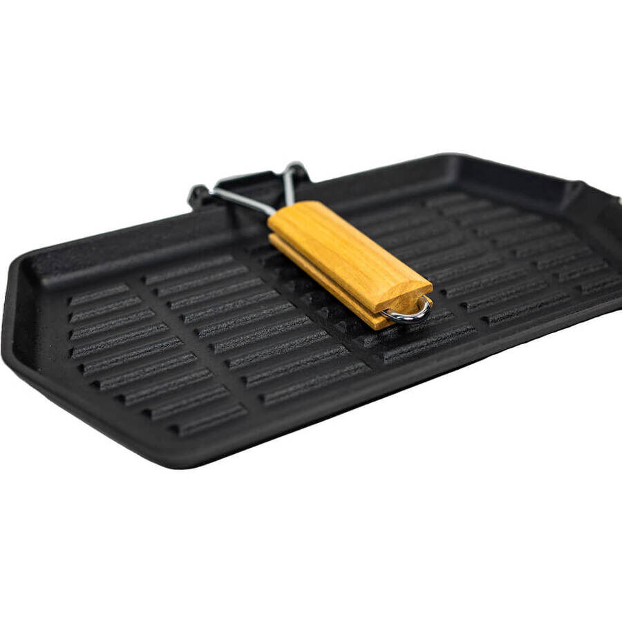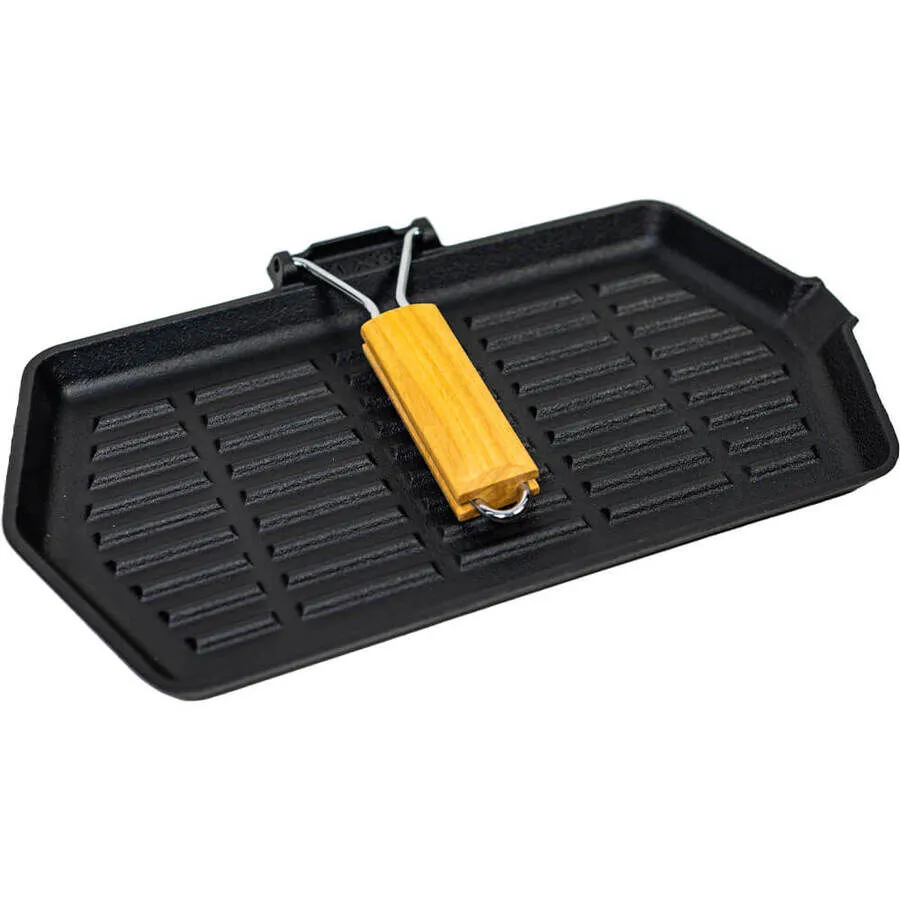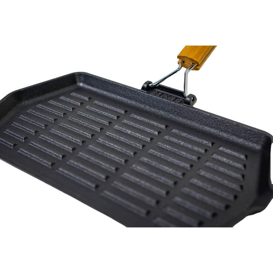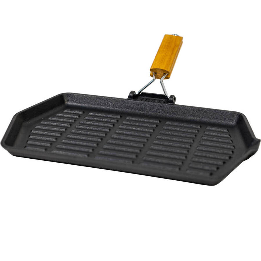 Sturdy cast-iron manufacture, so you get the same great quality whenever you use it. Provides even cooking due to excellent heat retention. Thoroughly pre-seasoned, enhancing longevity and requiring minimal after-care whilst conveniently creating a non-stick surface. Folding handle giving you more room to pack other essentials! Ribbed, griddle style base, perfect for cooking meat, steaks, burgers, and vegetables.