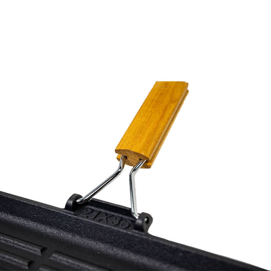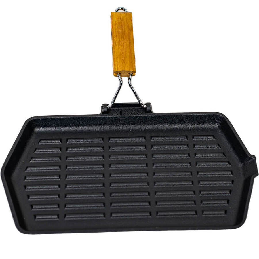 Supex Preseasoned Cast Iron Frypan with Folding Handle 210mm x 350mm. Complete with folding handle and griddle style non-stick base, you have the ultimate cookware item suitable for any meal or snack! Efficient frying and great heat retention only comes as a result of thorough pre-seasoning and well-devised design features.