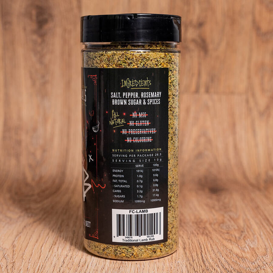 Flaming Coals Traditional Lamb Rub is a full-flavoured blend of herbs and spices making it the perfect companion for all lamb dishes. Whether it's lamb on the spit, cutlets on the BBQ's or a leg in the smoker, Flaming Coals Traditional Rub is all you need.