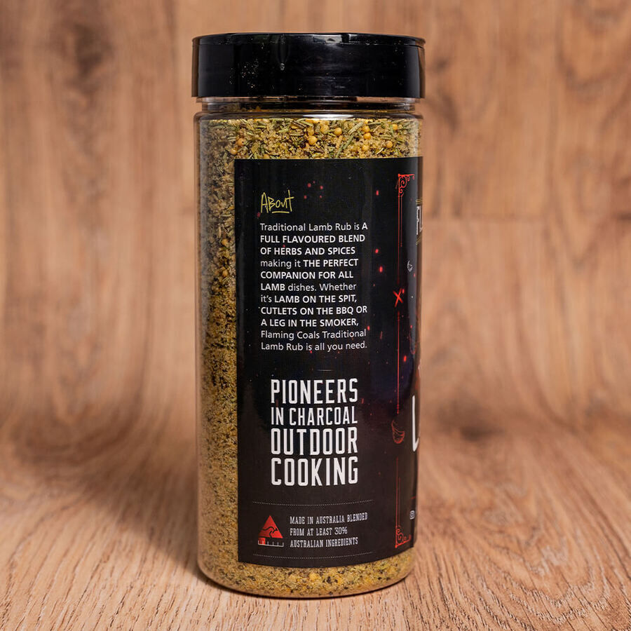 Flaming Coals Traditional Lamb Rub is a full-flavoured blend of herbs and spices making it the perfect companion for all lamb dishes. Whether it's lamb on the spit, cutlets on the BBQ's or a leg in the smoker, Flaming Coals Traditional Rub is all you need.