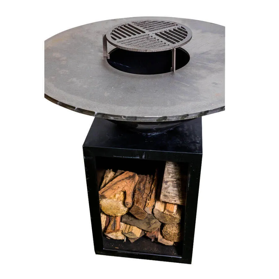 The design and simplicity of the raised fire pit, together with its built-in wooden storage compartment allow you to reach the wood and fuel the fire at any time. The grill plate is designed of 10mm thick black carbon steel that is weather-resistant, heat resistant, and versatile. The ideal colour symbiosis between the natural material and the mirror-like metal surface can be seen in the construction of this grill. The grills rusty appearance radiates elegance and simplicity, as blends in seamlessly with any setting.