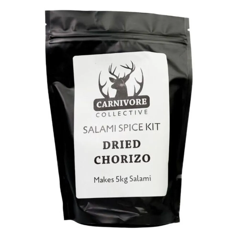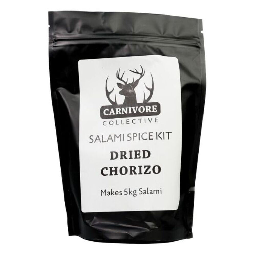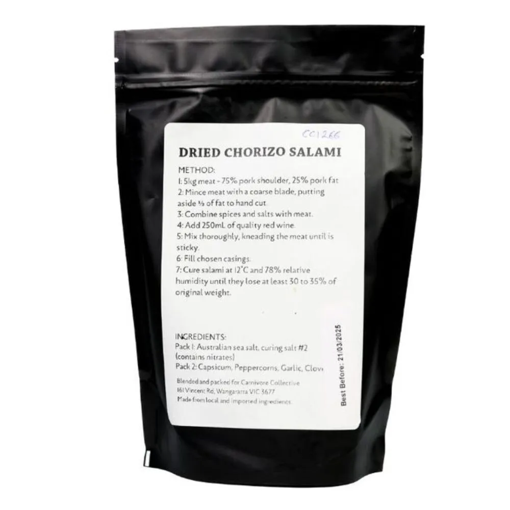 Dried Chorizo: This smoky, rich mix is reminiscent of a traditional Spanish dried sausage with a depth of flavour brought by three different types of capsicum (paprika). Ingredients: Australian Sea Salt, Curing Salt #2 (sulphates), Capsicum, Peppercorns, Garlic, Clove